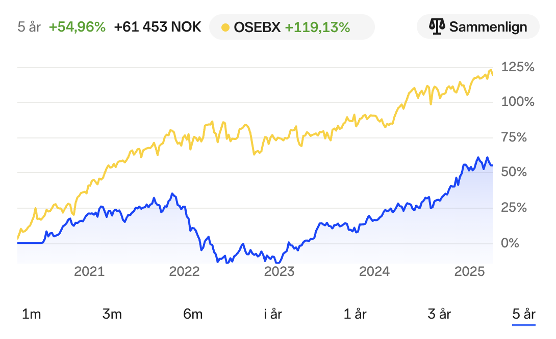 There’s also a “Compare with” option, where you can select one or more indexes: like OSEBX (the Norwegian stock market benchmark), DAX (top 40 public companies in Germany), or NASDAQ (which includes around 3,000 mostly tech-heavy companies from the US).